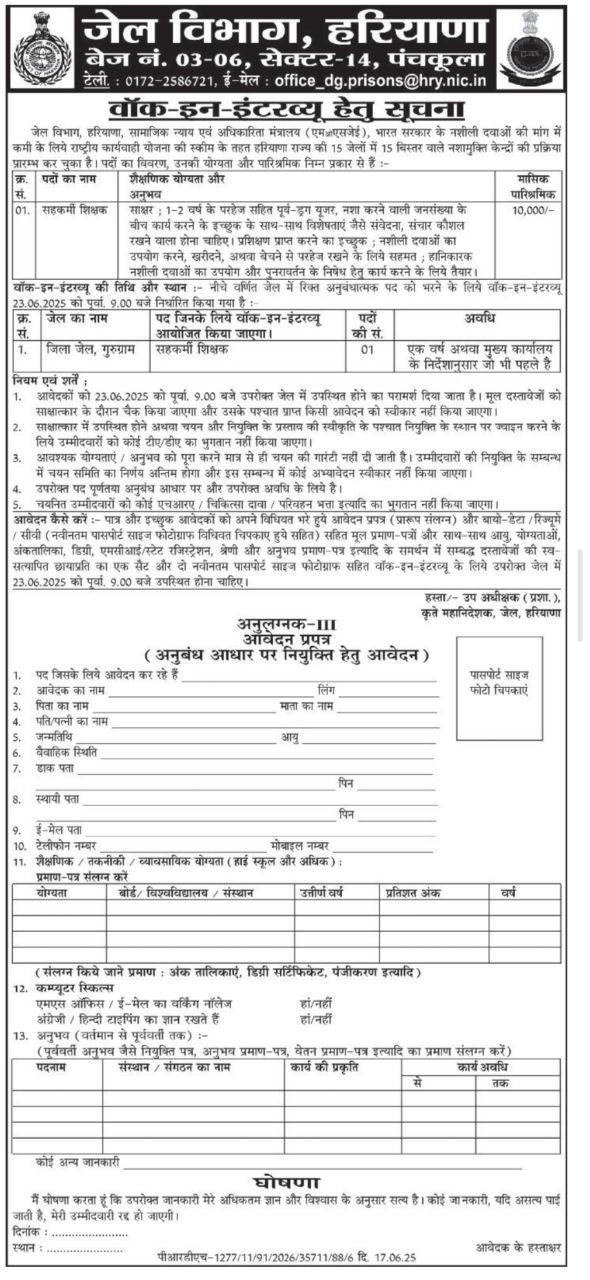 भर्ती के लिए आवेदन इच्छुक उम्मीदवारों को आवेदन फॉर्म/ बायोडाटा में नई पासपोर्ट आकर की फोटो लगा कर, दस्तावेजों की कॉपी के साथ 23 जून 2025 को सुबह 9 बजे जिला जेल गुरुग्राम में इंटरव्यू अटेंड करना है।