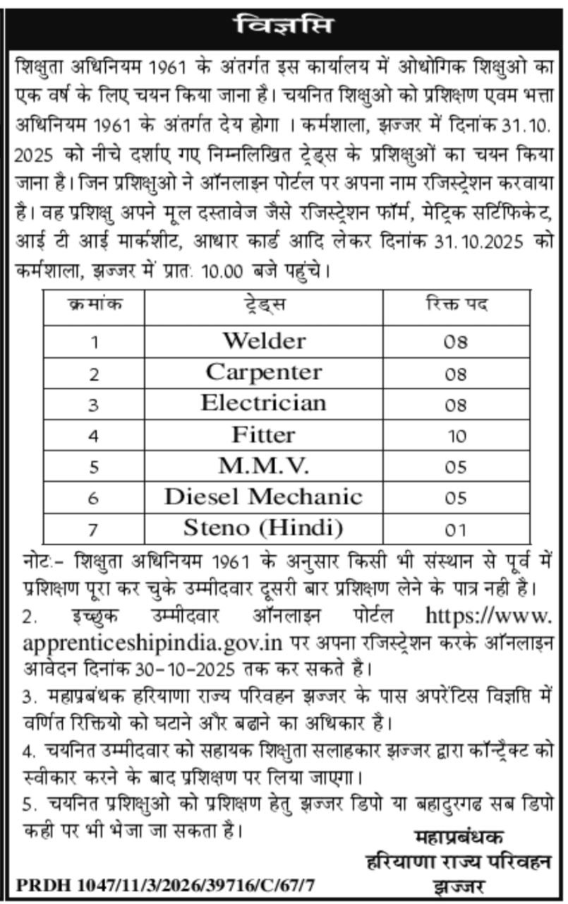 Jhajjar Roadways Vacancy 2025 : Jhajjar Raodways Department has released an official notification for the recruitment of Apprentice Post on a direct basis. Interested and Eligible candidates can check the application details from this Post. All the details related to Jhajjar Roadways Vacancy 2025 have been covered in this post.